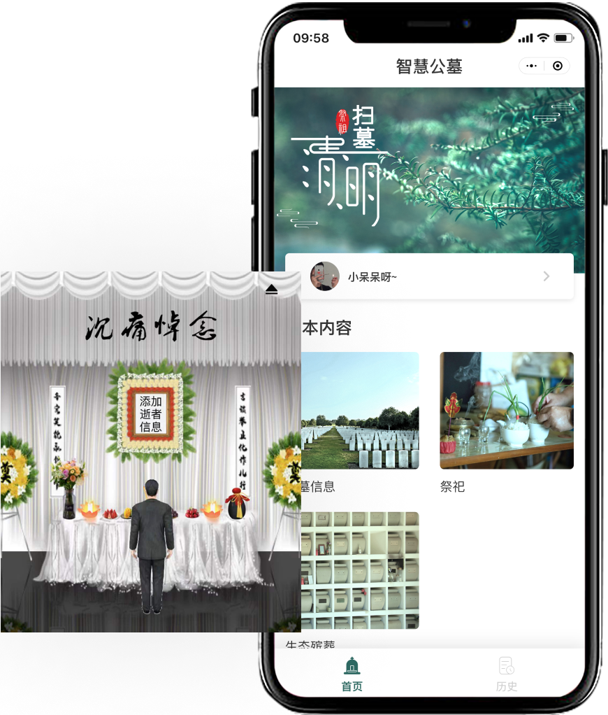 智慧公墓公共服务微信小程序,群众用手机端小程序查询办丧流程、办丧指南及相关公墓信息。搭建网上预约祭祀的端口,群众可在线预约祭祀时间,或进行网上祭祀,避免人流高峰。